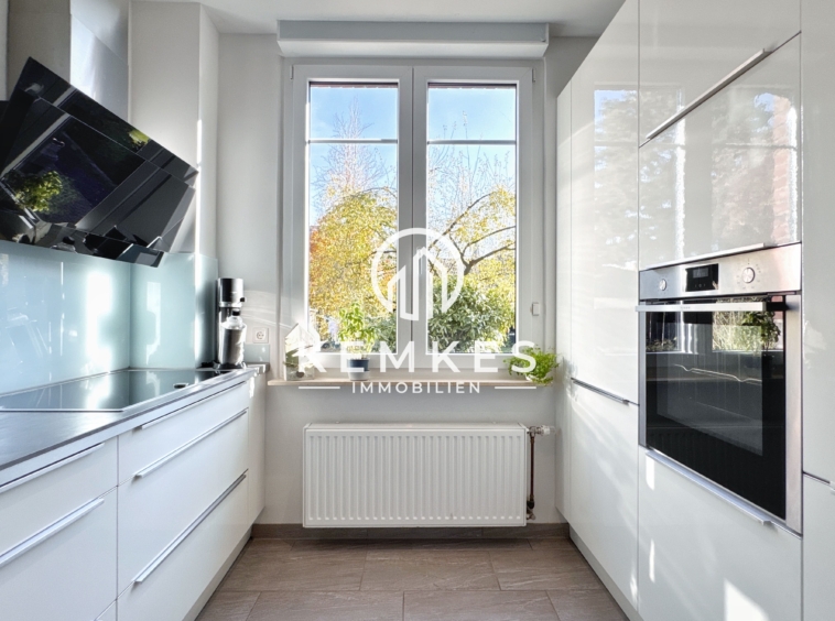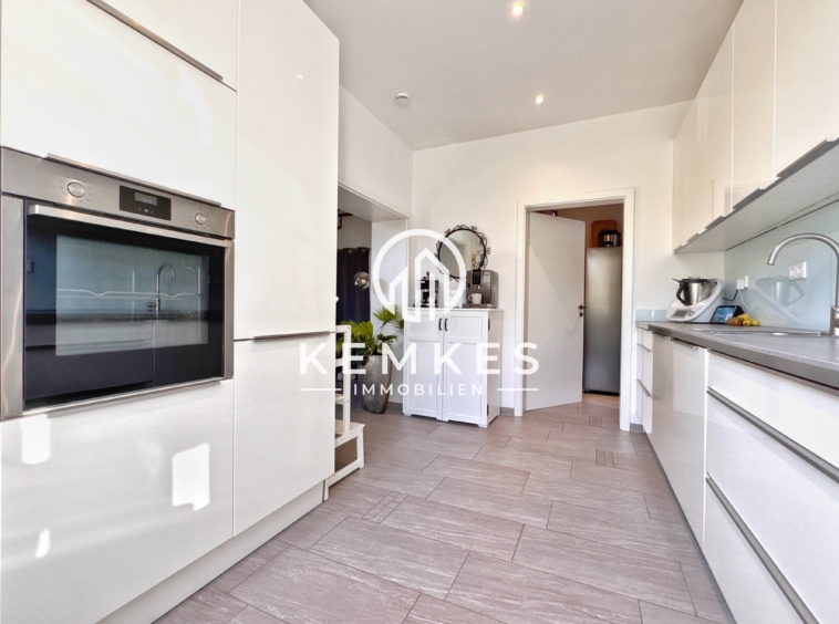 Rechts vom Empfangsbereich gelangen Sie in die stilvoll gestaltete Küche, die durch einen breiten, modernen Durchgang optisch geöffnet wird. Die hochwertige Einbauküche aus dem Jahr 2018 überzeugt mit einem eleganten weißen Hochglanzdesign, die dem Raum zusätzlichen Stil und Leichtigkeit verleiht. Direkt angrenzend befindet sich ein praktischer Hauswirtschafts- bzw. Vorratsraum, der gleichzeitig als Durchgang nach draußen dient und Platz für weitere Haushaltsgeräte oder einen zusätzlichen Gefrierschrank bietet.