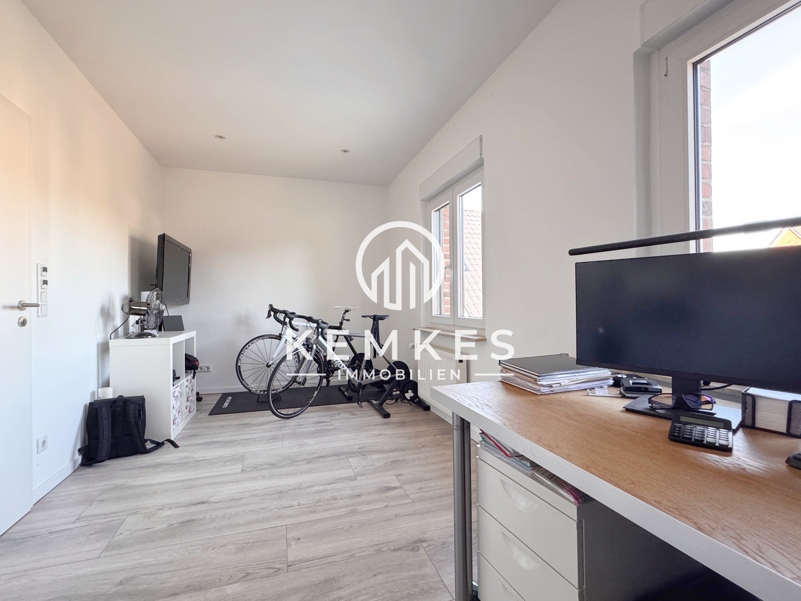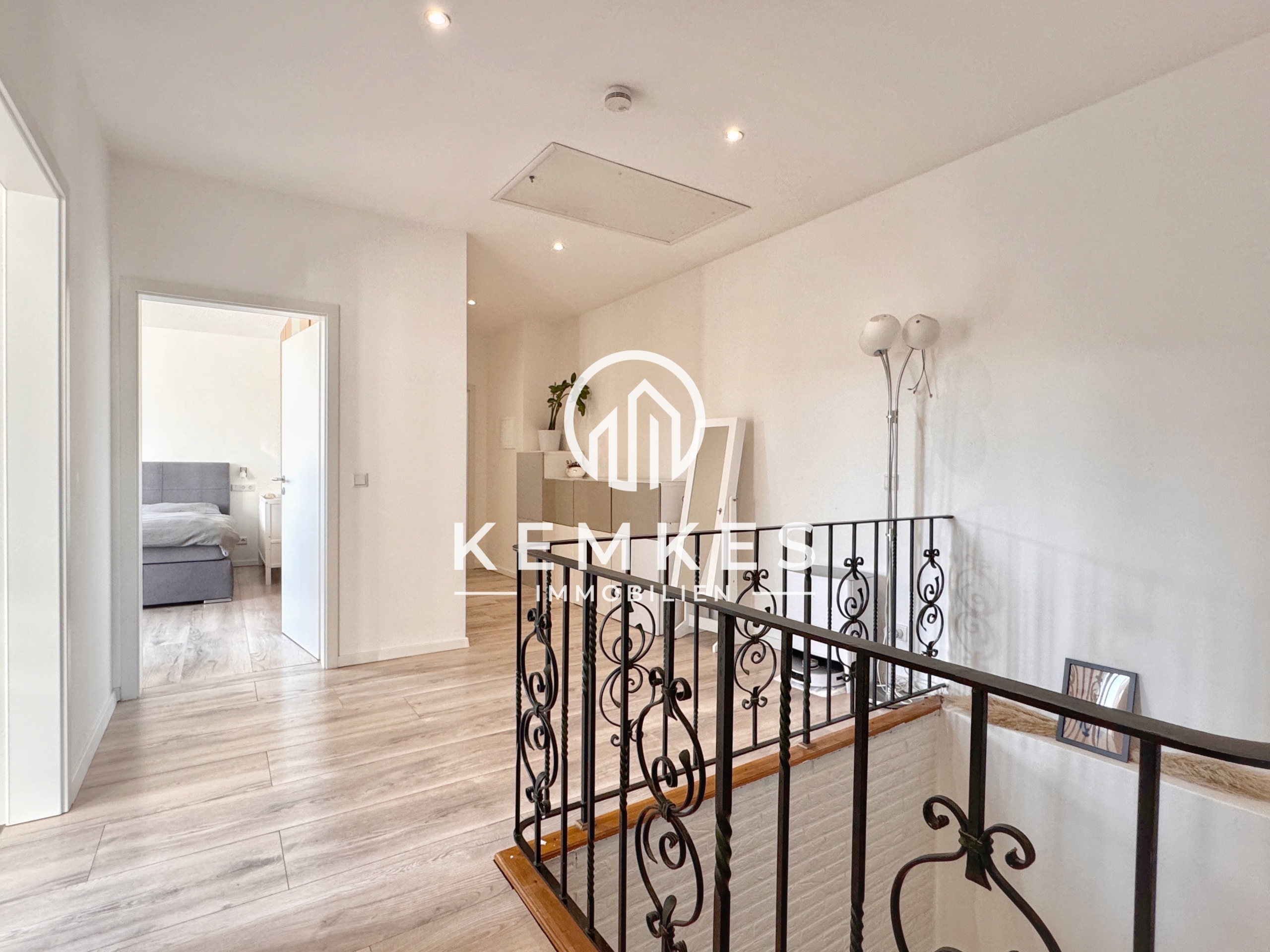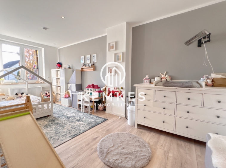 Das Obergeschoss empfängt Sie mit einem elegant gestalteten Flur, der eine offene und wohnliche Atmosphäre schafft und Ihnen Zugang zu sämtlichen Räumlichkeiten bietet. Das Elternschlafzimmer sowie die beiden Kinderzimmer überzeugen durch ihre großzügigen Grundrisse und bieten flexible Nutzungsmöglichkeiten – ob als komfortabel gestaltete Schlafzimmer, ruhige Arbeitsbereiche oder inspirierende Hobbyzimmer.