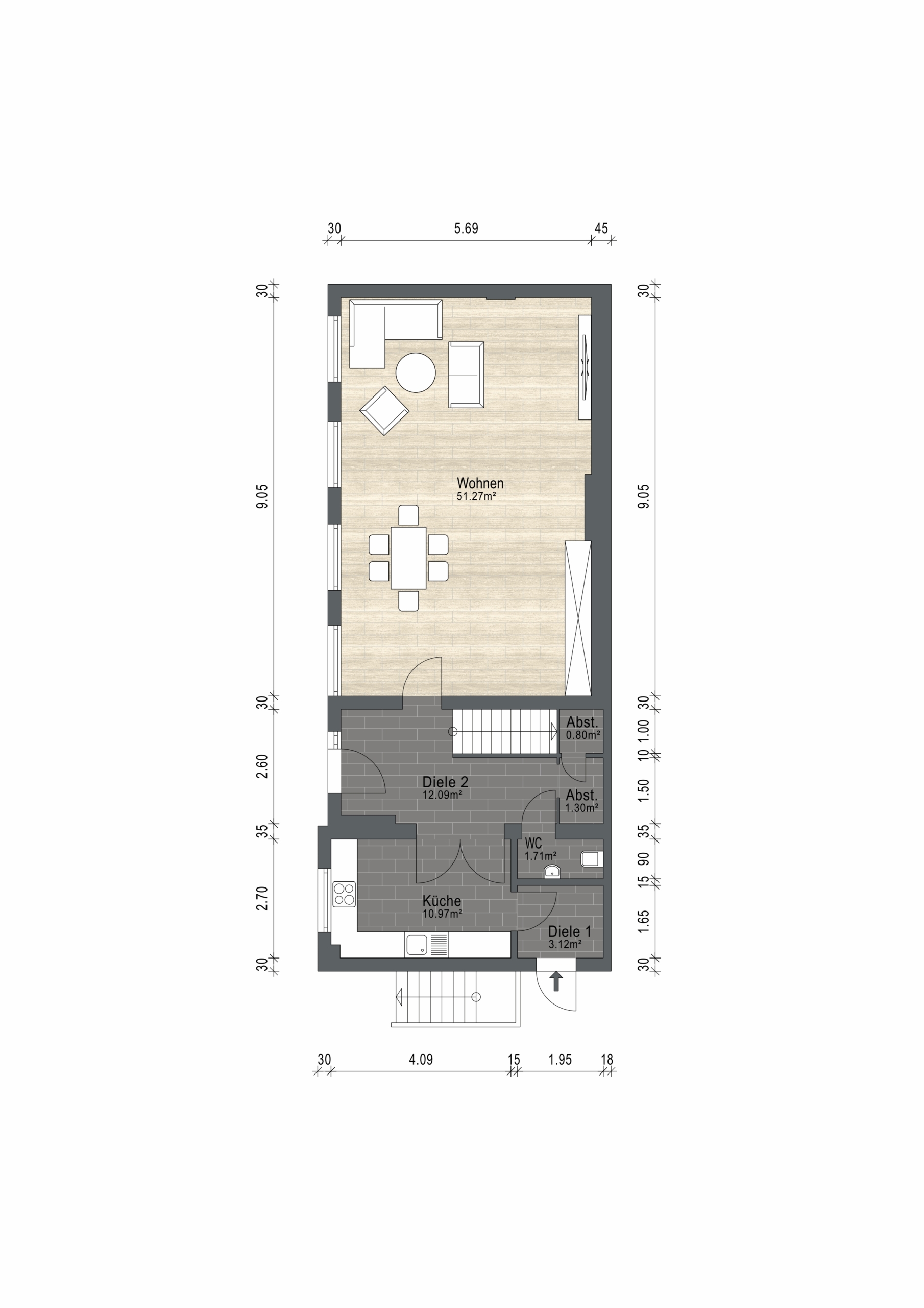 Im Erdgeschoss befinden sich zudem ein Gäste-WC sowie ein Abstellraum unter der offen gehaltenen Treppe.